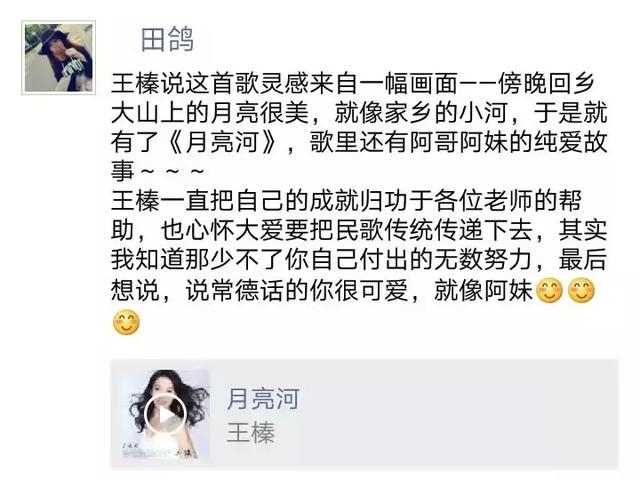 珠海音樂廣播《小樹開門》的主播小樹在評價王榛的《月亮河》時說,這是一首充滿深情的歌曲,沒有華麗的辭藻卻感人至深,無需高亢的音調卻余音繞梁,王榛的《月亮河》為中國的歌壇增加了亮點;唐山交通文藝廣播的主播田鴿在專訪完王榛后,在自己的朋友圈寫道:“王榛說這首歌靈感來自一幅畫面——傍晚回鄉(xiāng)大山上的月亮很美,就像家鄉(xiāng)的小河,于是就有了《月亮河》,歌里還有阿哥阿妹的純愛故事……王榛一直把自己的成就歸功于各位老師的幫助,也心懷大愛要把民歌傳統(tǒng)傳遞下去,其實我知道那少不了王榛自己付出的無數(shù)努力,最后想說,會說常德話的王榛很可愛,就像阿妹一樣親切可人!”