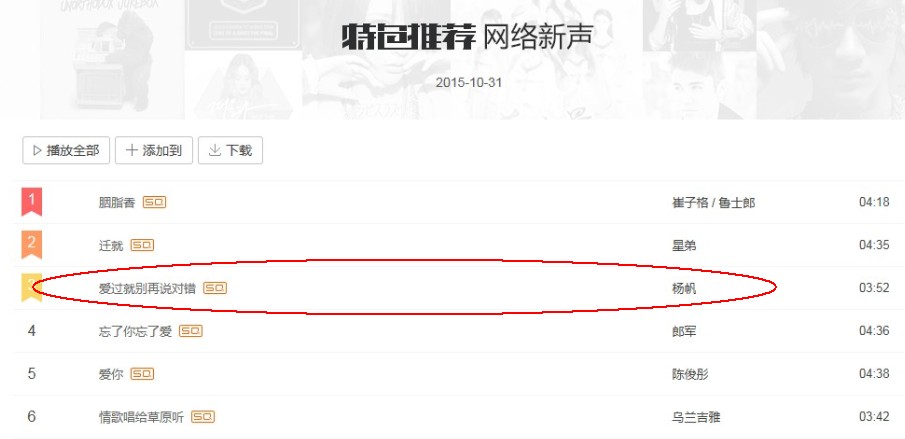 【映帆娛樂資訊】楊帆《愛過就別再說對錯》榮登QQ音樂特色推薦網絡新聲前三名!